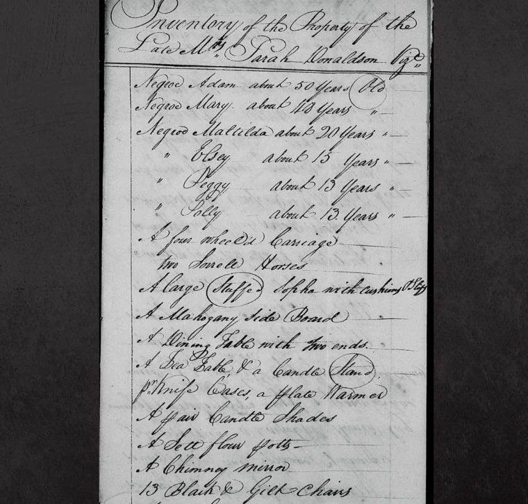 “Inventory of the property of the late Mrs. Sarah Donaldson,” March 1809, North Carolina Estate Files, 1663-1979, accessed via Familysearch.org