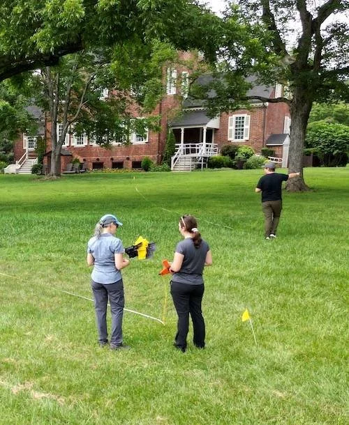 On the week of July 24, 2023, the Richard Hampton Jenrette Foundation (then the Classical American Homes Preservation Trust) hosted two days of archaeological investigations at Ayr Mount. Faculty and graduate students from Clemson University and the University of North Carolina—Chapel Hill conducted ground penetrating radar (GPR) surveys of two locations to learn more about features that are hidden beneath the surface. GPR is useful, because it allows archaeologists to carry out non-destructive investigations of a site. Without tools like this, we would need to remove significant amounts of soil to look for things that may (or may not) be present, a process that can be both time consuming and irreversible.